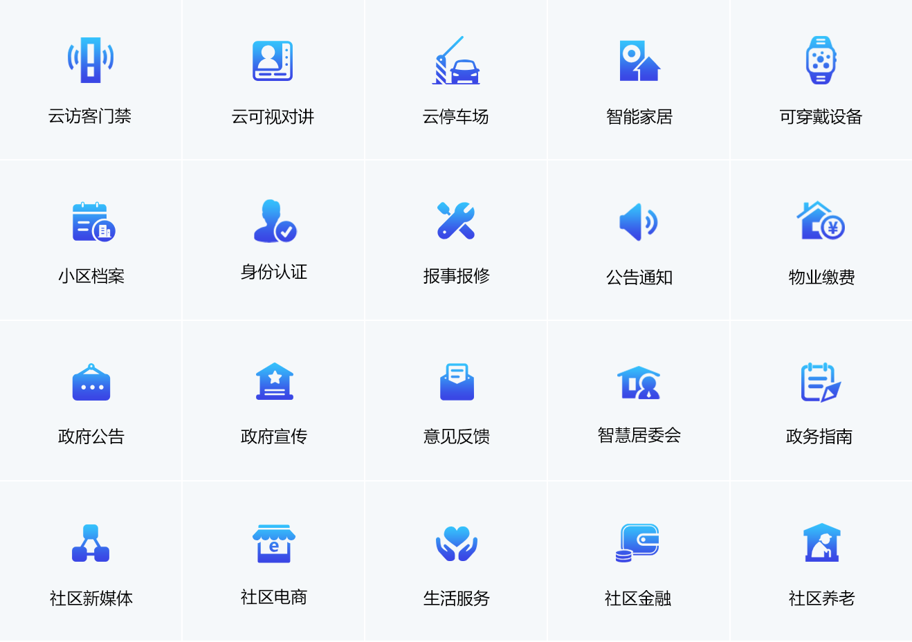運用AI、物聯網、SaaS、ARVR等全新技術為未 來智慧社區建設提供智能化支撐。 其主要含車輛管理、智能廣播和發布宣傳、出入口人臉識別、 智能安防、危險識別與報警、智能梯控、 小區內智能步道、社區智慧體側和保健小屋、 一鍵求助報警、智能家居、小區物業綜合服務平臺、 智能大數據可視化系統等功能模塊。系統包括地市級、 區縣級管理平臺,兼顧建設標準及地方使用實際。 實現“多途徑采集、多鏈路傳輸、多層級儲存、 多中心處理、多平臺共享”。